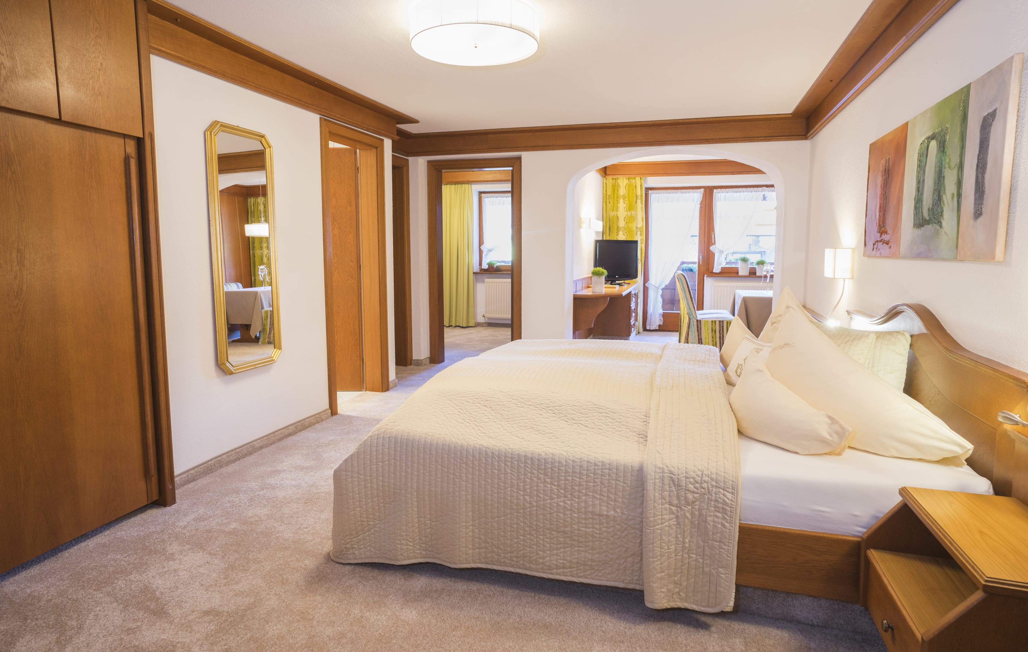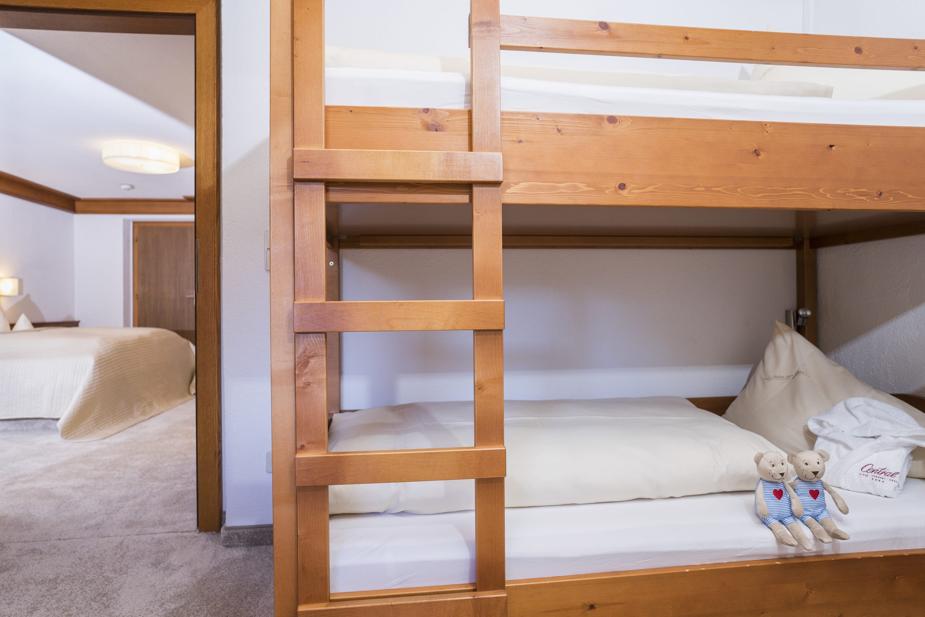 traditioneller Stil mit separatem Kinderzimmer mit Stockbett, Elternschlafzimmer mit Wohnteil, Bad mit Duschwand, separates WC, Balkon, Sat TV, Radio, Telefon, Haarfön, Internetanschluss und Safe